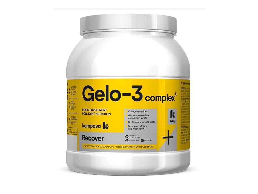 Unikátne zloženie Gelo-3 complex® zabezpečí namáhaným kĺbom tú najlepšiu výživu – obsahuje nie len hydrolyzovaný kolagén, ale aj Glukozamín sulfát, Chondroitín sulfát, vitamín C, vápnik a horčík v organickej forme a tak komplexne vyživuje pohybový aparát. Podporuje tiež obnovu mäkkých štruktúr a urýchľuje regeneráciu kĺbového aparátu. Glukozamín sulfát a chondroitín sulfát sú stavebné zložky kĺbovej chrupavky a spojivových tkanív, ktoré podporujú pevnosť a pružnosť vašich kĺbov. Bohužiaľ, vekom a neustálym tlakom na kĺby ich množstvo ubúda.