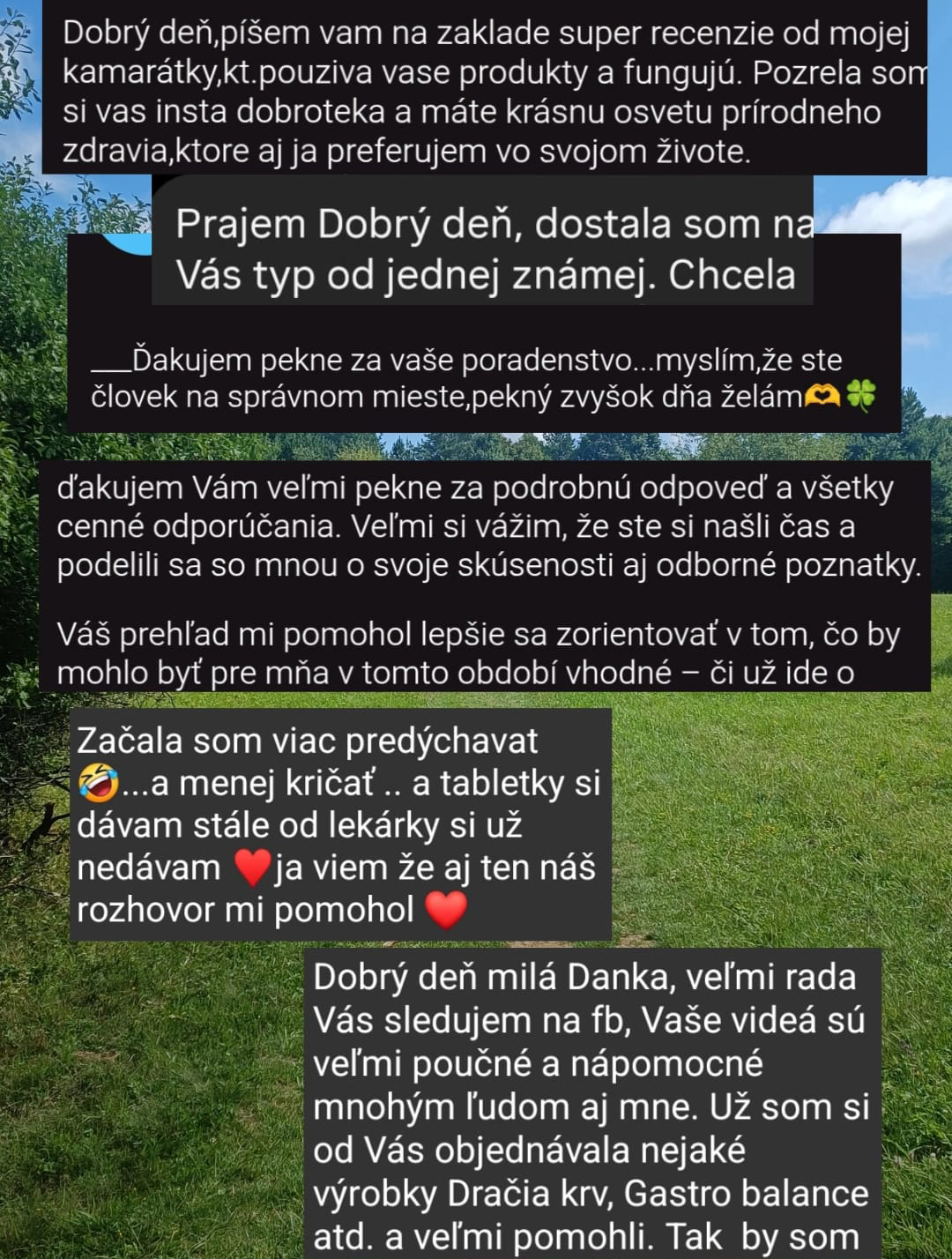 Na Váš dotazník si vyhradím čas, preštudujem ho a spíšem Vám mailom môj komentár k popísanému problému, odporúčania na životosprávu a zvolím produkty do ucelenej prírodnej kúry Vám na mieru.