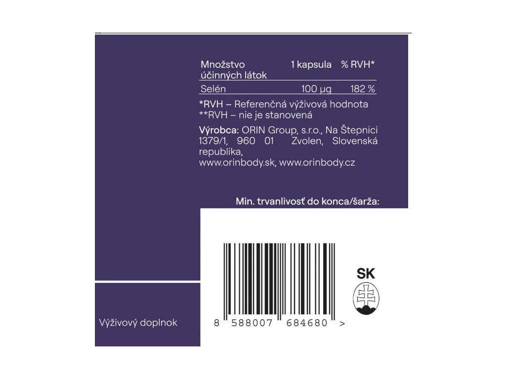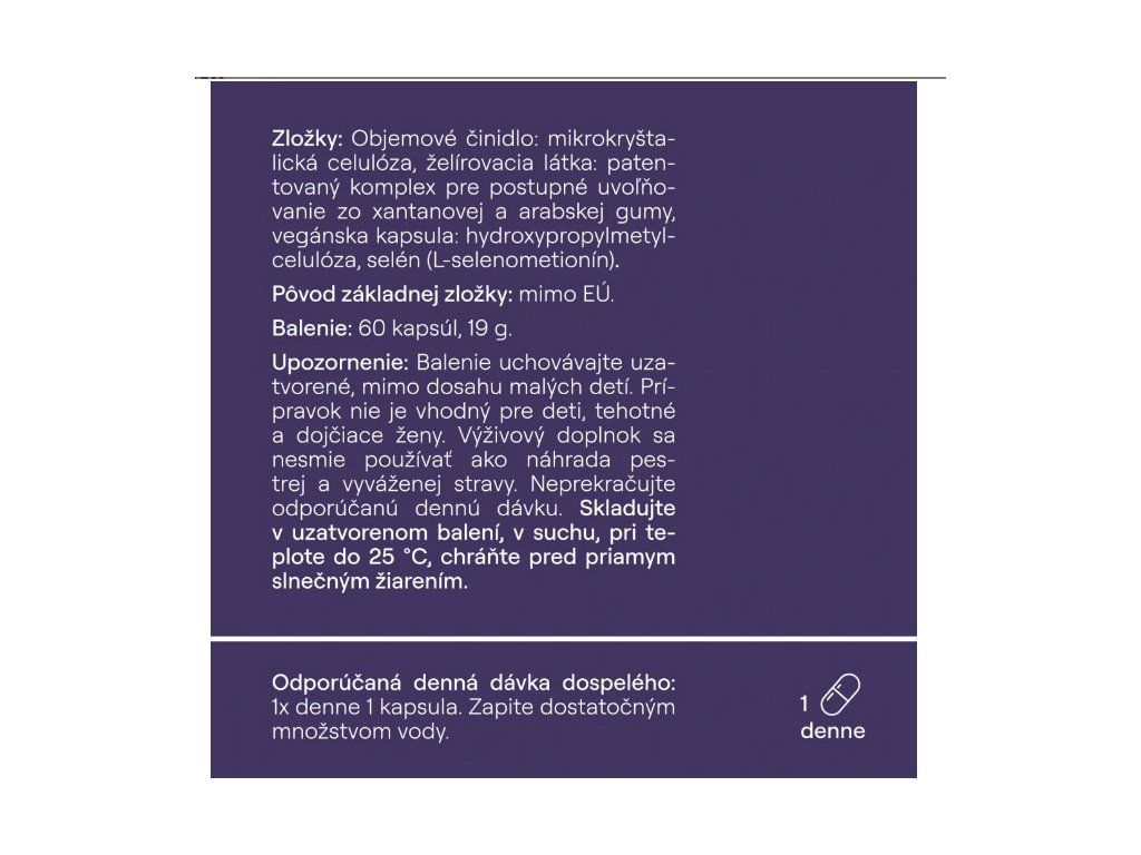 Zložky: Objemové činidlo: mikrokryštalická celulóza, želírovacia látka: patentovaný komplex pre postupné uvoľňovanie zo xantanovej a arabskej gumy, vegánska kapsula: hydroxypropylmetylcelulóza, selén (L-selenometionín).